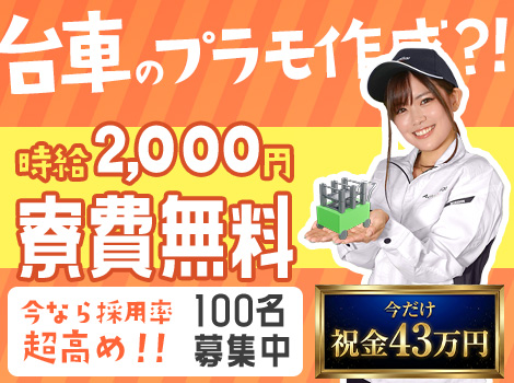 今だけ祝金43万★時給2,000円+寮費無料★台車の「プラモデル」を作成して運ぶだけ?!