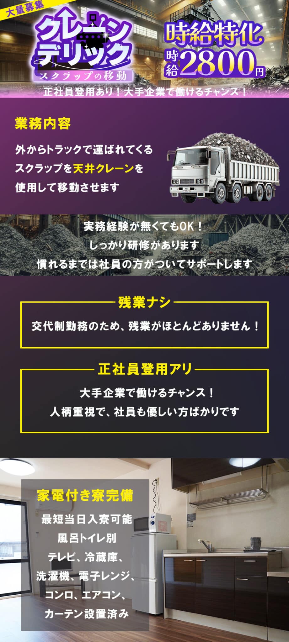 【月収53万円以上可能】強力磁石で集める!天井クレーンでスクラップの移動業務♪