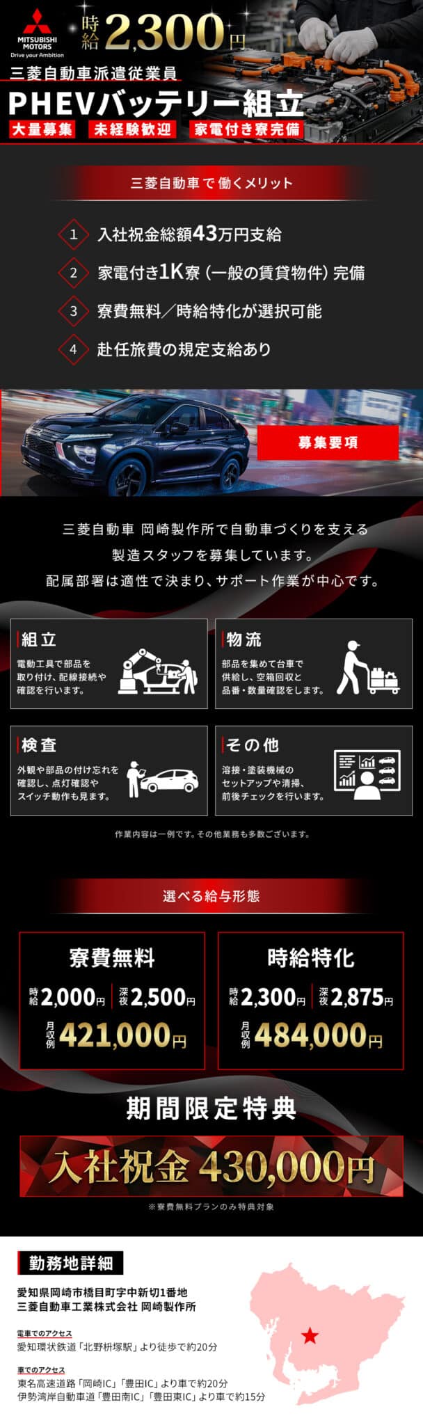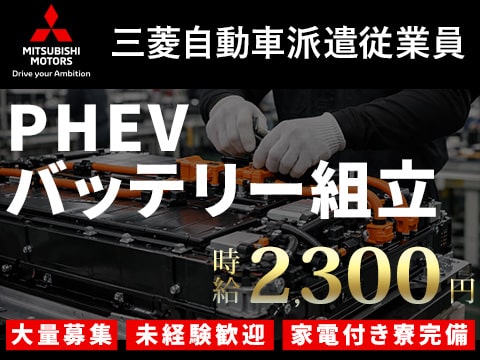 【大量募集】三菱自動車岡崎製作所で電気自動車(PHEV)のバッテリー組立業務 時給2,300円
