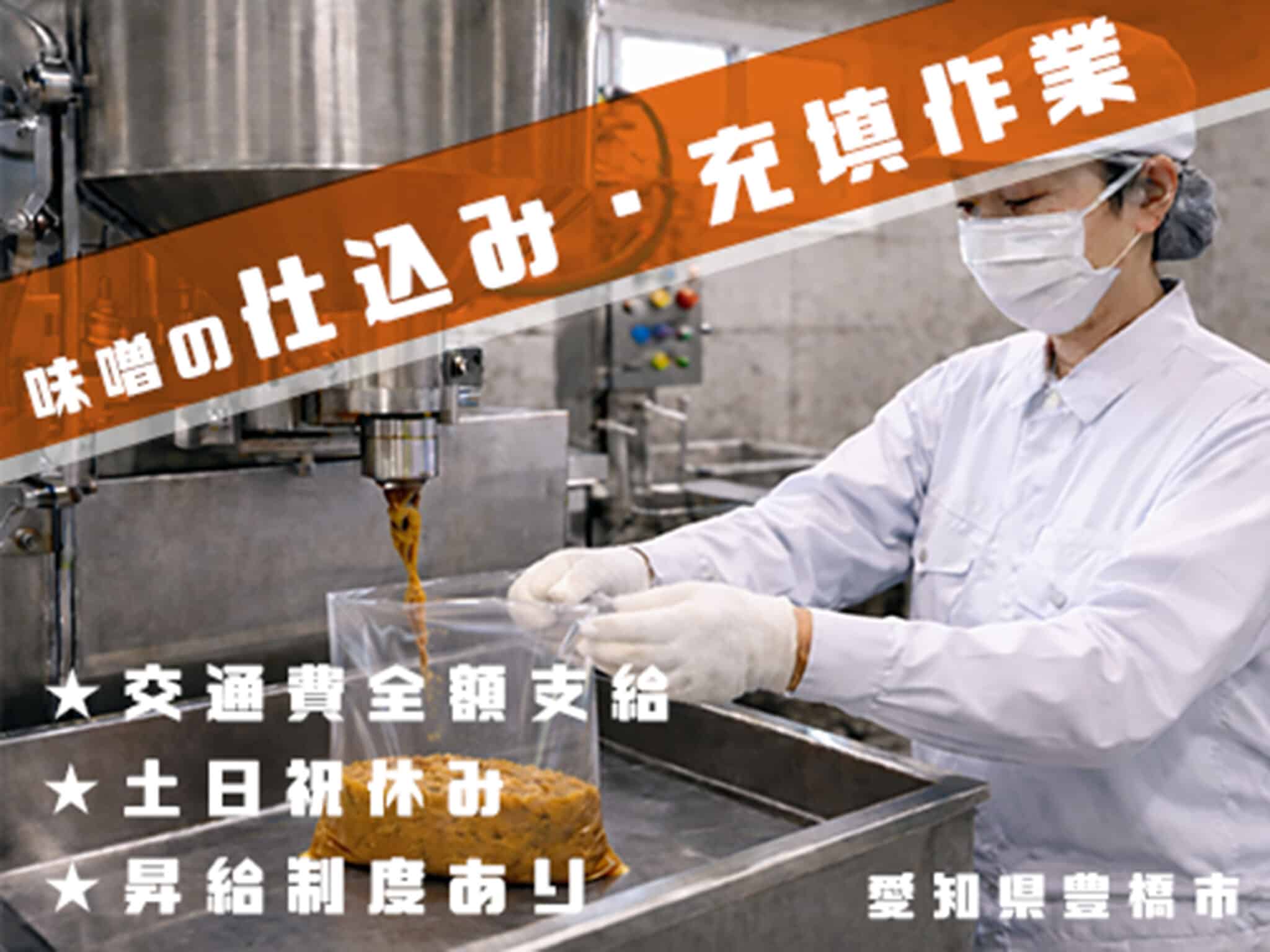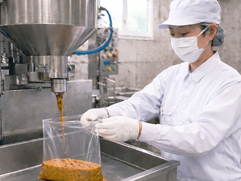 ・充填作業:発酵させた味噌を手作業で袋に詰めていきます。