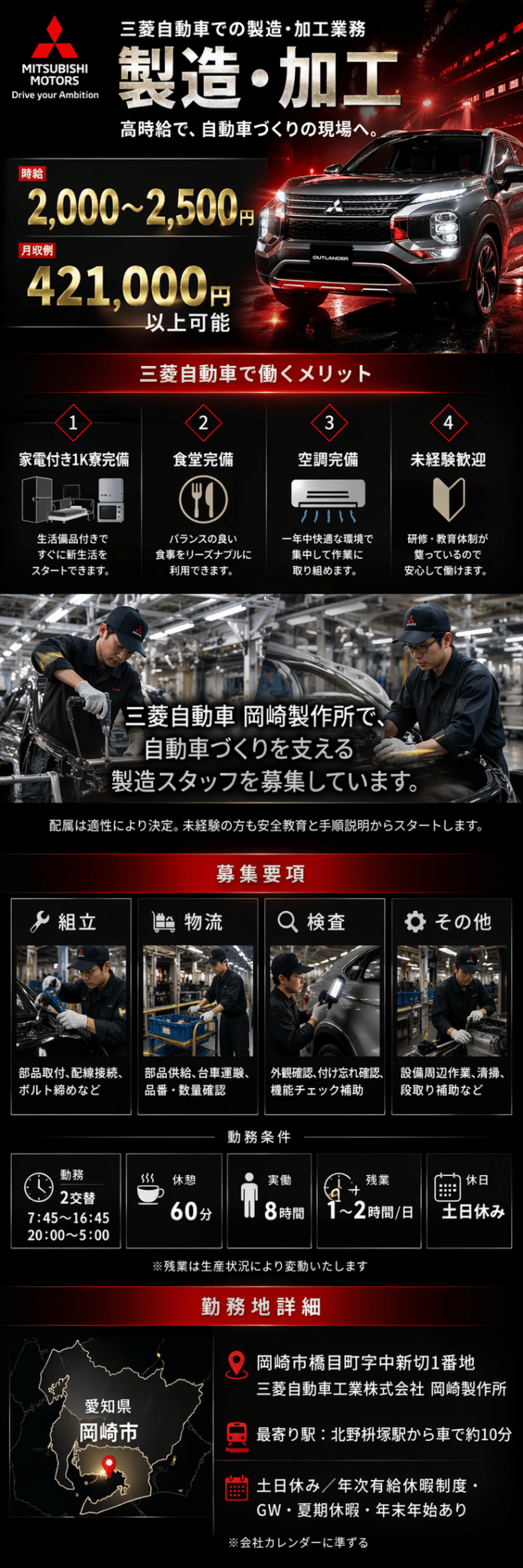 【大量募集】三菱自動車岡崎製作所で組立などの製造に関わる業務
